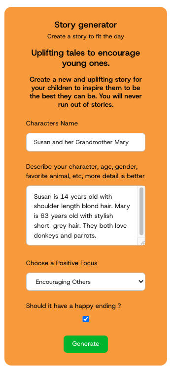 Here is what I generated in two minutes using NonStopStories. My Granddaughter loved it while it reminded her of the value of encouraging others.